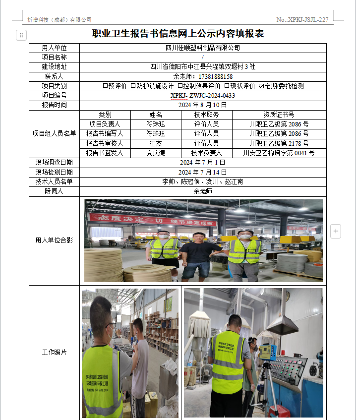 四川佳顺塑料制品有限公司定期检测