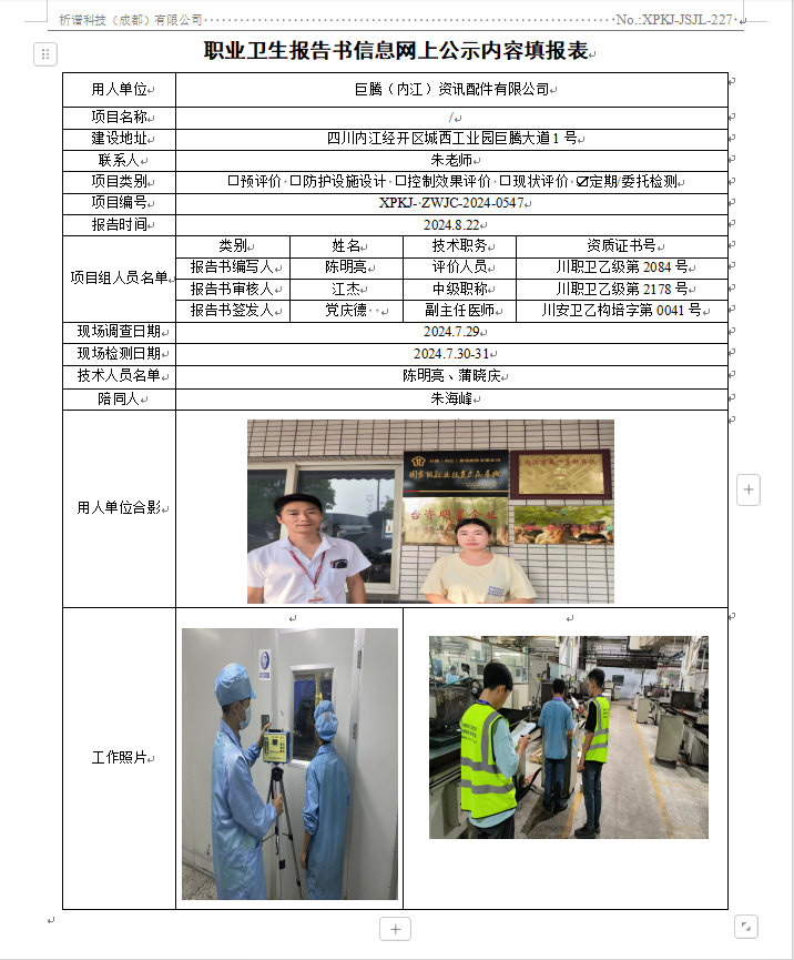 巨腾(内江)资讯配件有限公司定期检测