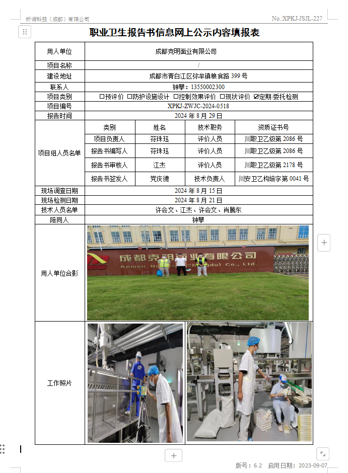 成都克明面业有限公司定期检测