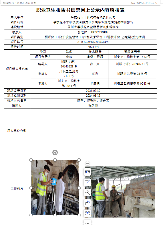 攀枝花市千帆铁钛有限责任公司定期检测