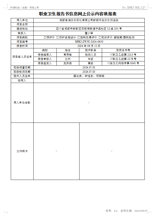 成都富鸿分水石化有限公司新都木兰分水加油站定期检测