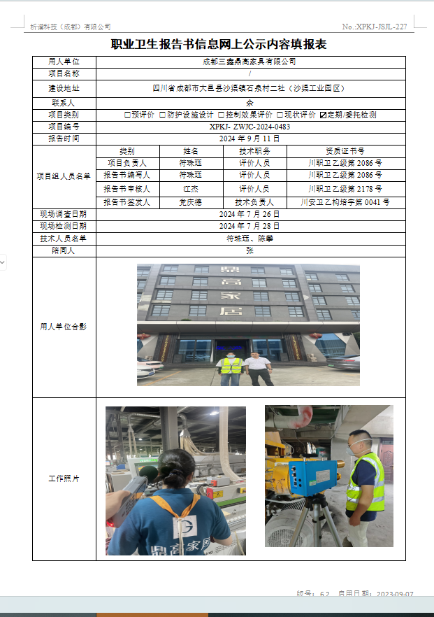 成都三鑫鼎高家具有限公司定期检测