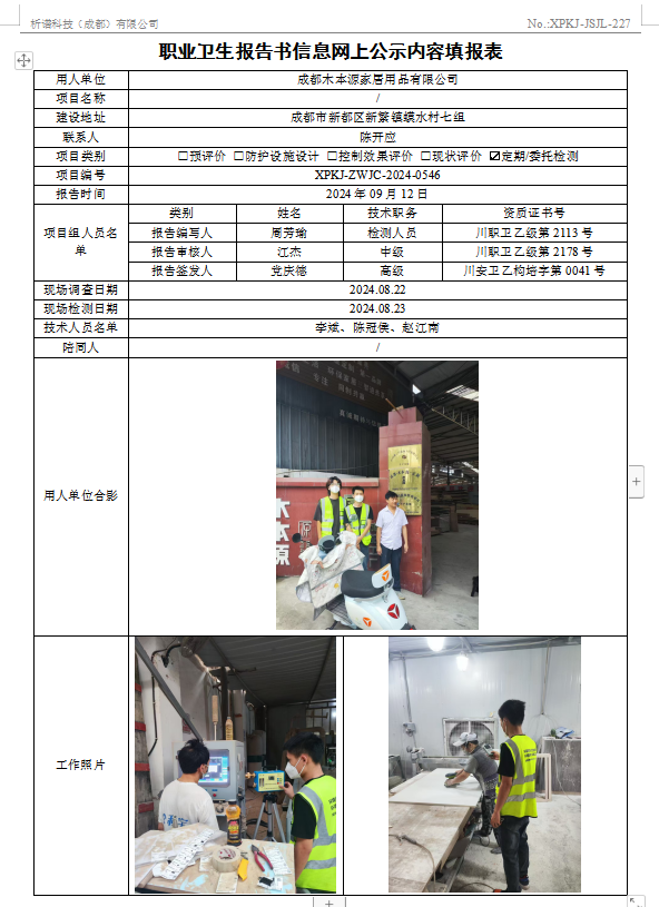 成都木本源家居用品有限公司定期检测