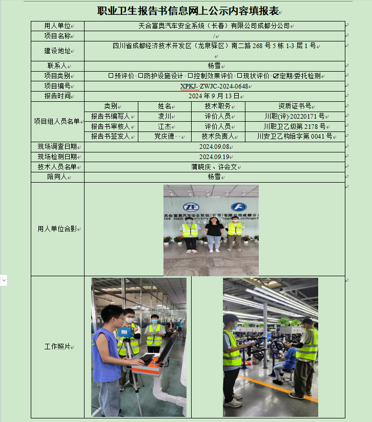 天合富奥汽车安全系统(长春)有限公司成都分公司定期检测