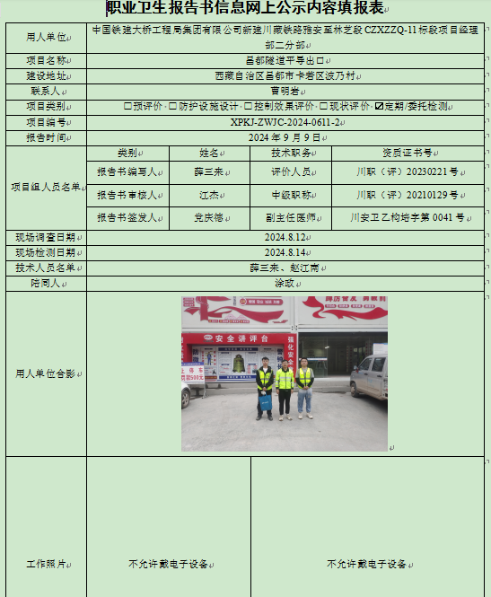 中国铁建大桥工程局集团有限公司新建川藏铁路雅安至林芝段CZXZZQ-11标项目经理部二分部昌都隧道平导出口定期检测