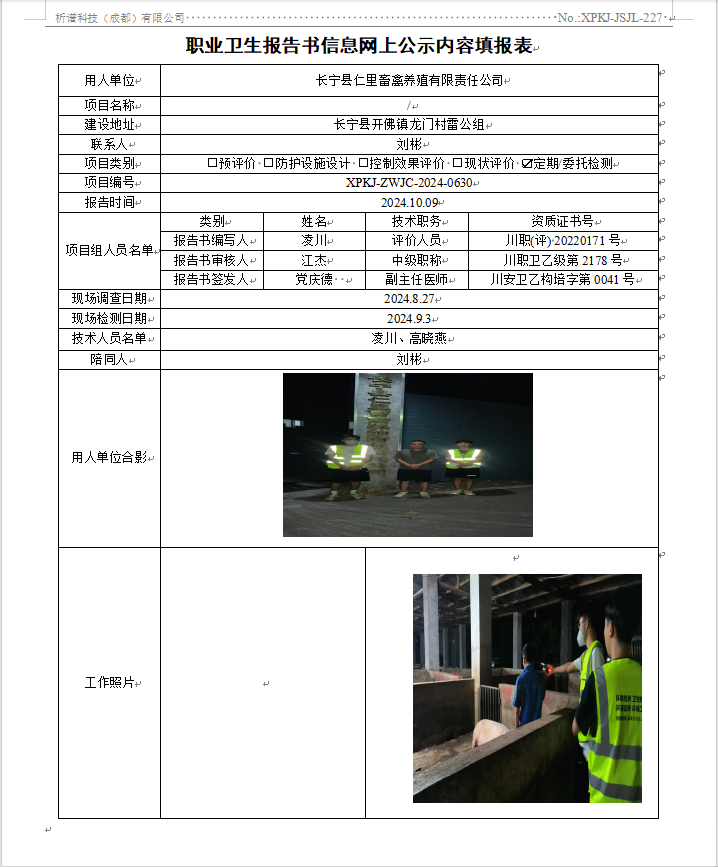 长宁县仁里畜禽养殖有限责任公司定期检测
