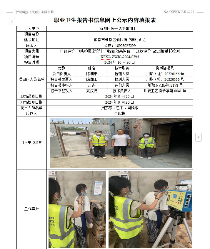 新都区盛兴达木器加工厂职业病危害定期检测