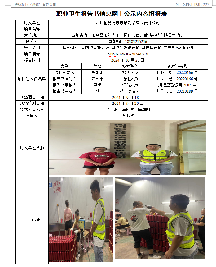 四川恒鑫博创玻璃制品有限责任公司职业病危害定期检测