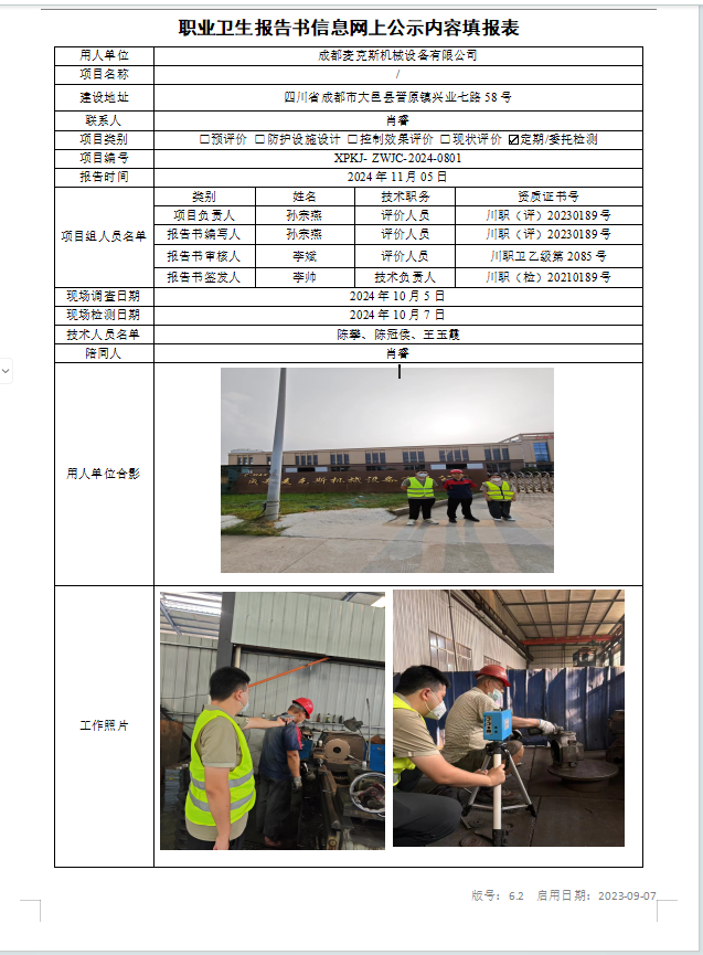成都麦克斯机械设备有限公司职业病危害定期检测