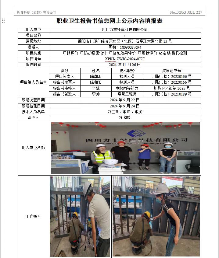 四川力丰绿建科技有限公司职业病危害因素定期检测
