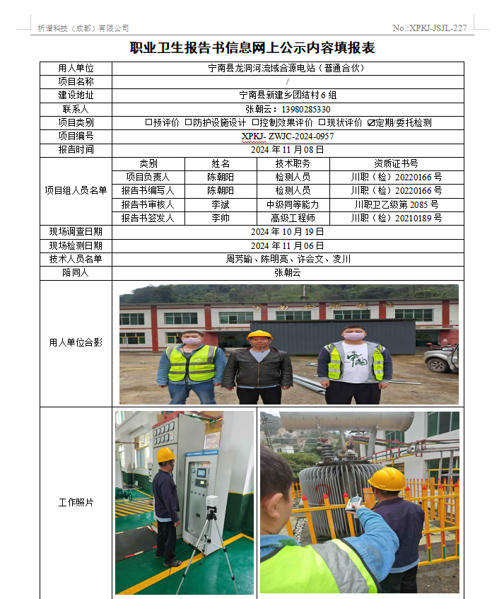 宁南县龙洞河流域合源电站(普通合伙)职业病危害因素定期检测