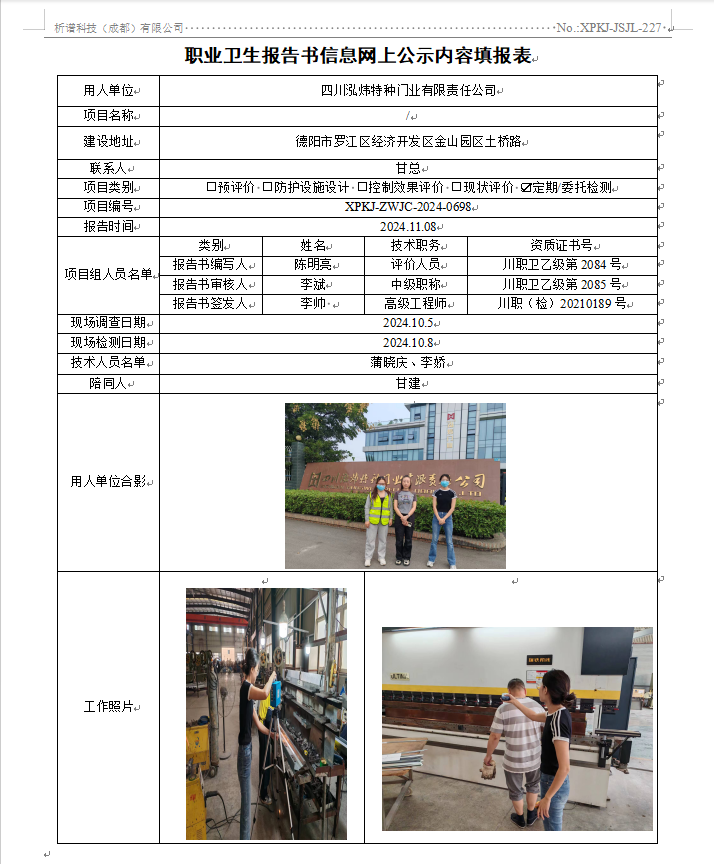 四川泓炜特种门业有限责任公司职业病危害因素定期检测