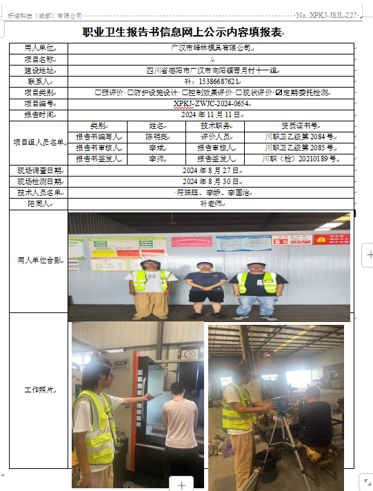 广汉市峰林模具有限公司职业病危害因素定期检测