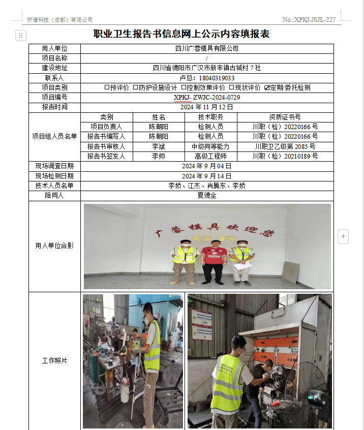 四川广蓉模具有限公司职业病危害因素定期检测