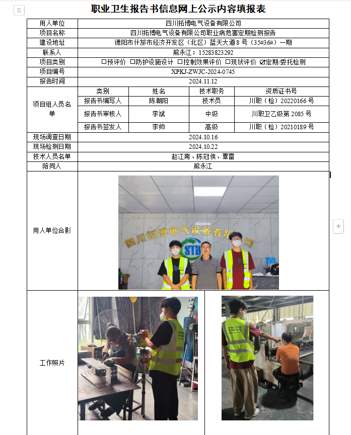 四川拓博电气设备有限公司职业病危害因素定期检测