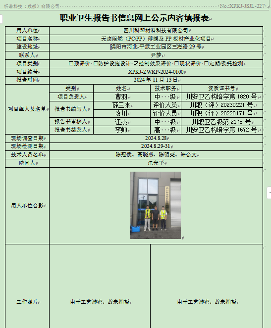 成都新恒瑞家具有限公司职业病危害因素定期检测