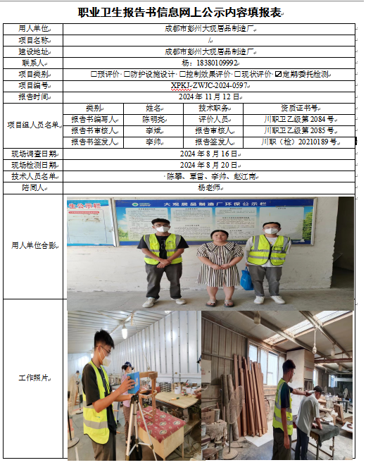 成都市彭州大观居品制造厂职业病危害因素定期检测