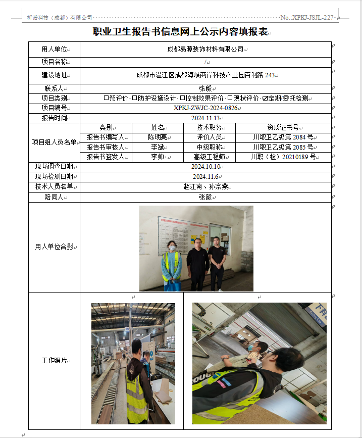 成都易源装饰材料有限公司职业病危害因素定期检测