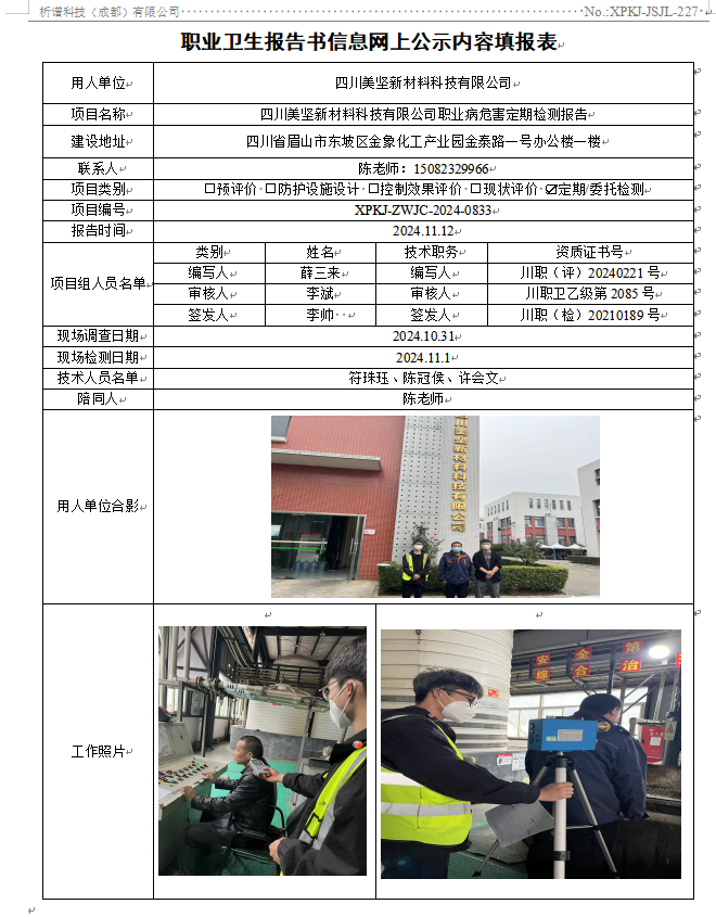 四川美坚新材料科技有限公司职业病危害因素定期检测