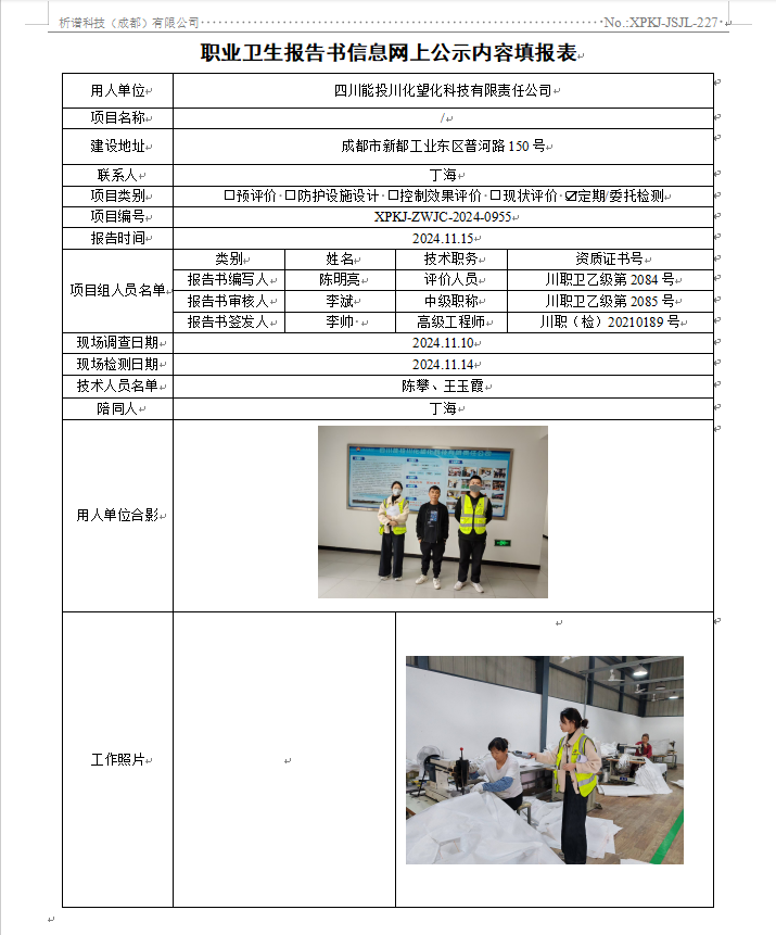 四川能投川化望化科技有限责任公司职业病危害因素定期检测