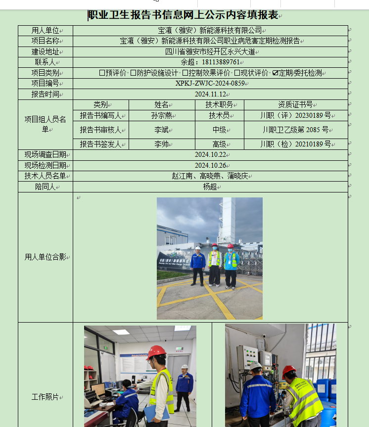 宝瀛(雅安)新能源科技有限公司职业病危害因素定期检测