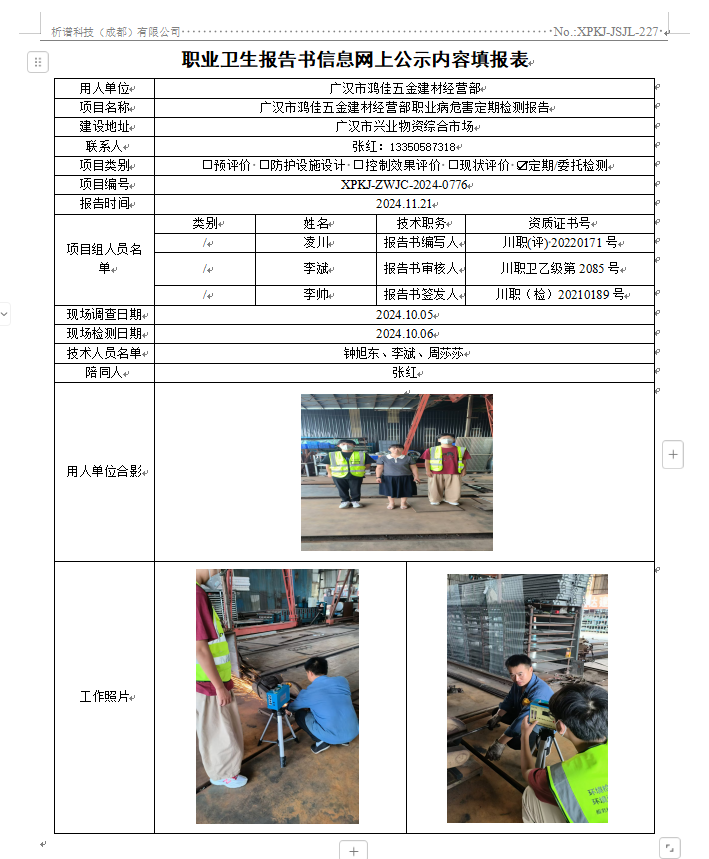 广汉市鸿佳伍金建材经营部职业病危害因素定期检测