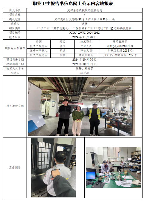 成都金鼎机械设备有限公司职业病危害因素定期检测