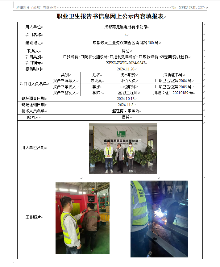 成都幕尼黑电梯有限公司职业病危害因素定期检测