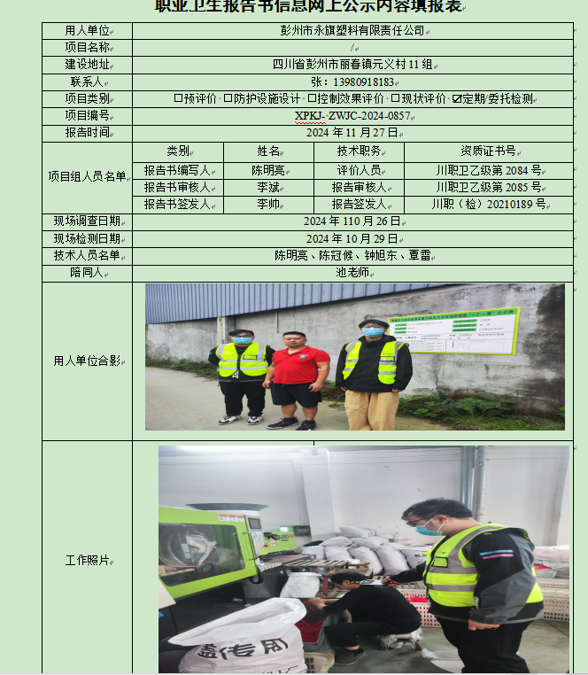 彭州市永旗塑料有限责任公司职业病危害因素定期检测