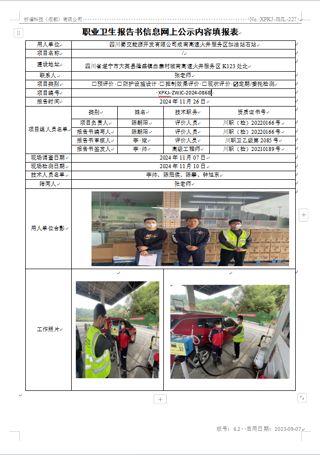 四川蜀交能源开发有限公司成南高速火井服务区加油站右站职业病危害因素定期检测