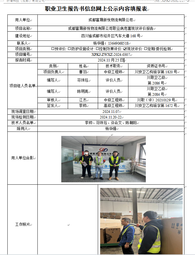 成都富晟新悦物流有限公司职业病危害因素现状评价