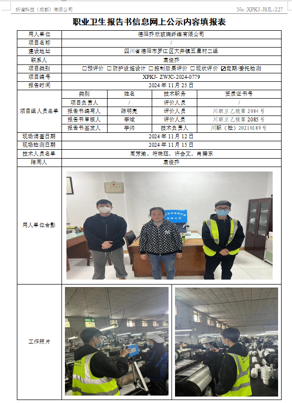德阳乔欣玻璃纤维有限公司职业病危害因素定期检测