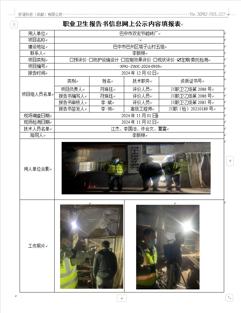 巴中市双宏节能砖厂职业病危害因素定期检测