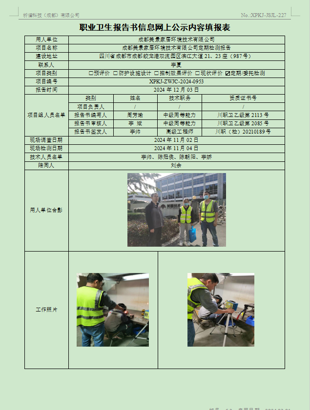 成都景美家居环境技术有限公司职业病危害因素定期检测