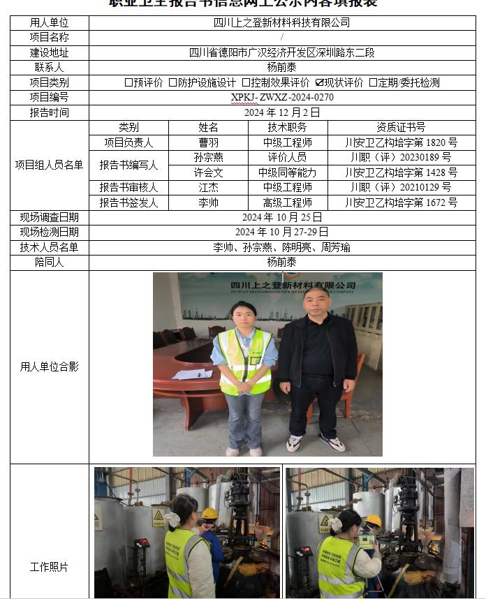 四川上之登新材料科技有限公司职业病危害因素现状评价