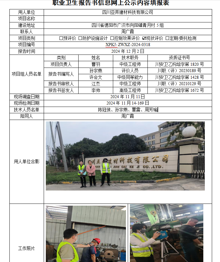 四川亚奔建材科技有限公司职业病危害因素现状评价