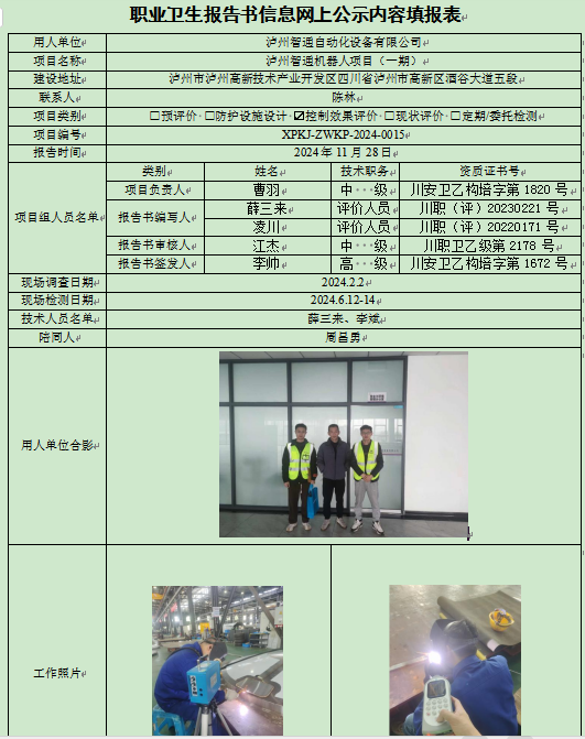 泸州智通自动化设备有限公司 智通机器人项目(一期)职业病危害因素控制效果评价
