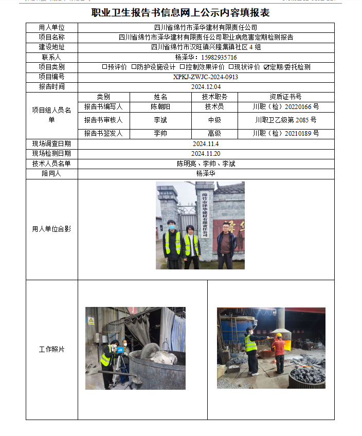 四川省绵竹市泽华建材有限责任公司职业病危害因素定期检测