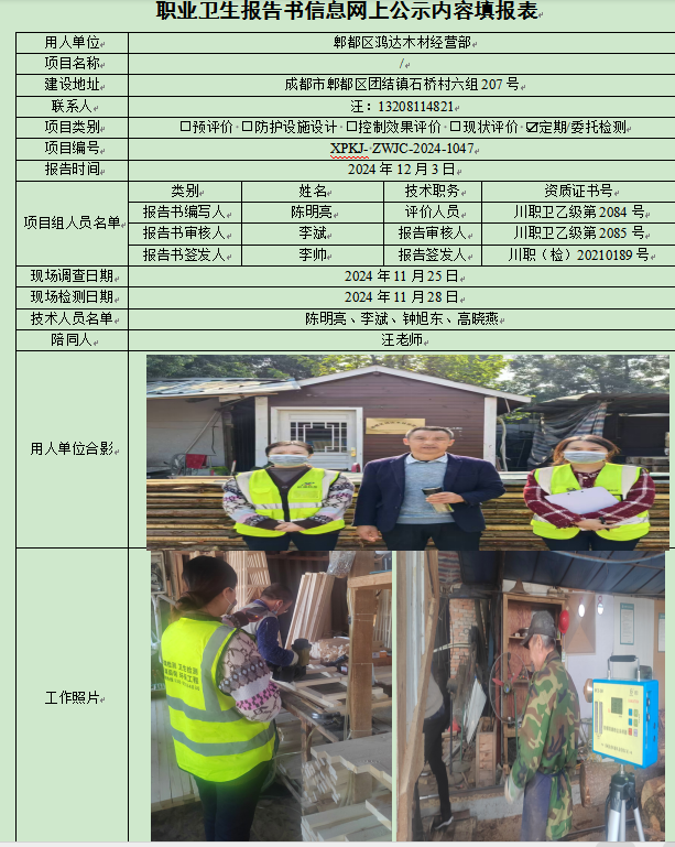郫都区鸿达木材经营部职业病危害因素定期检测
