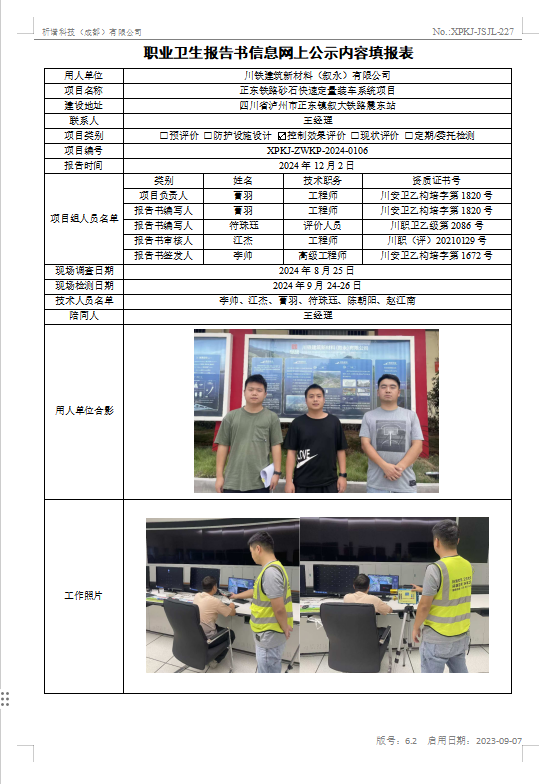 川铁建筑新材料(叙永)有限公司职业病危害因素控制效果评价