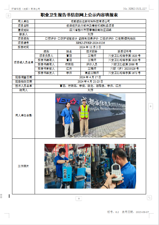 成都威仕达新材料科技有限公司职业病危害因素控制效果评价