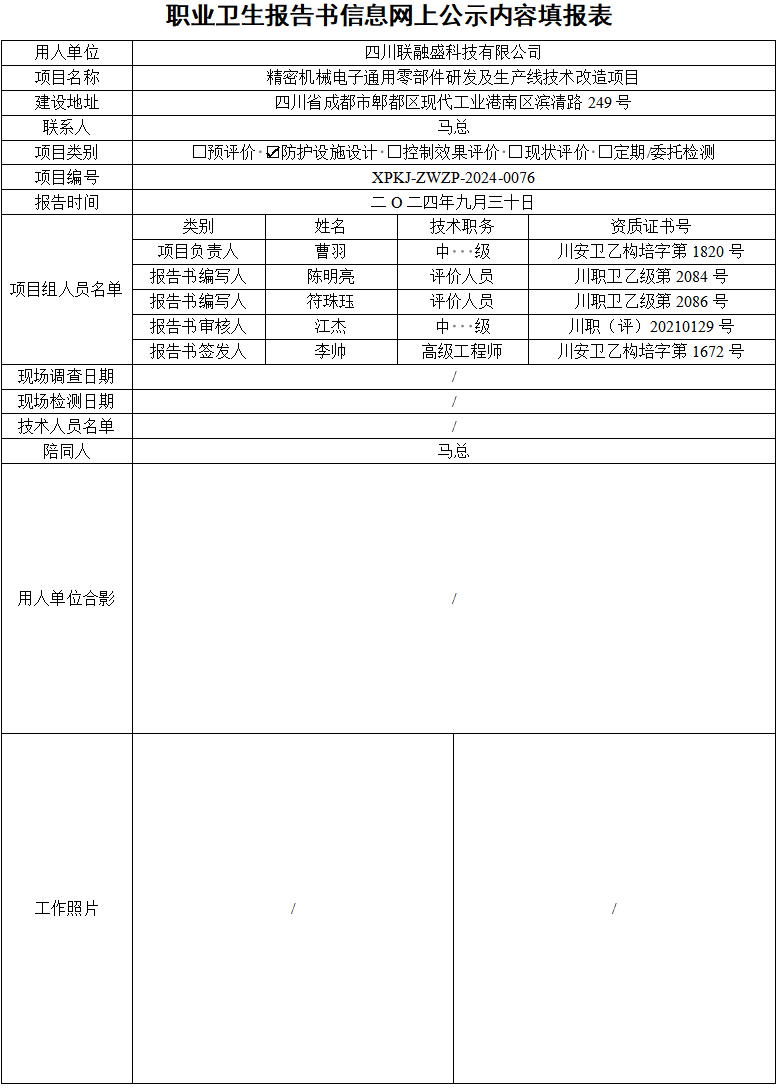 四川联融盛科技有限公司职业病危害因素预评价报告