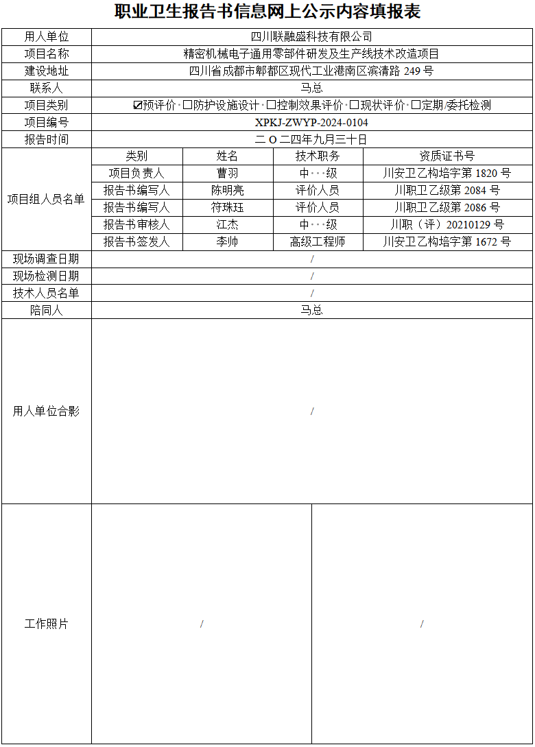 四川联融盛科技有限公司职业病危害因素预评价报告