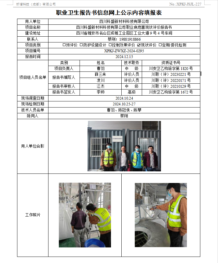 四川科盛新材料科技有限公司职业病危害因素现状评价