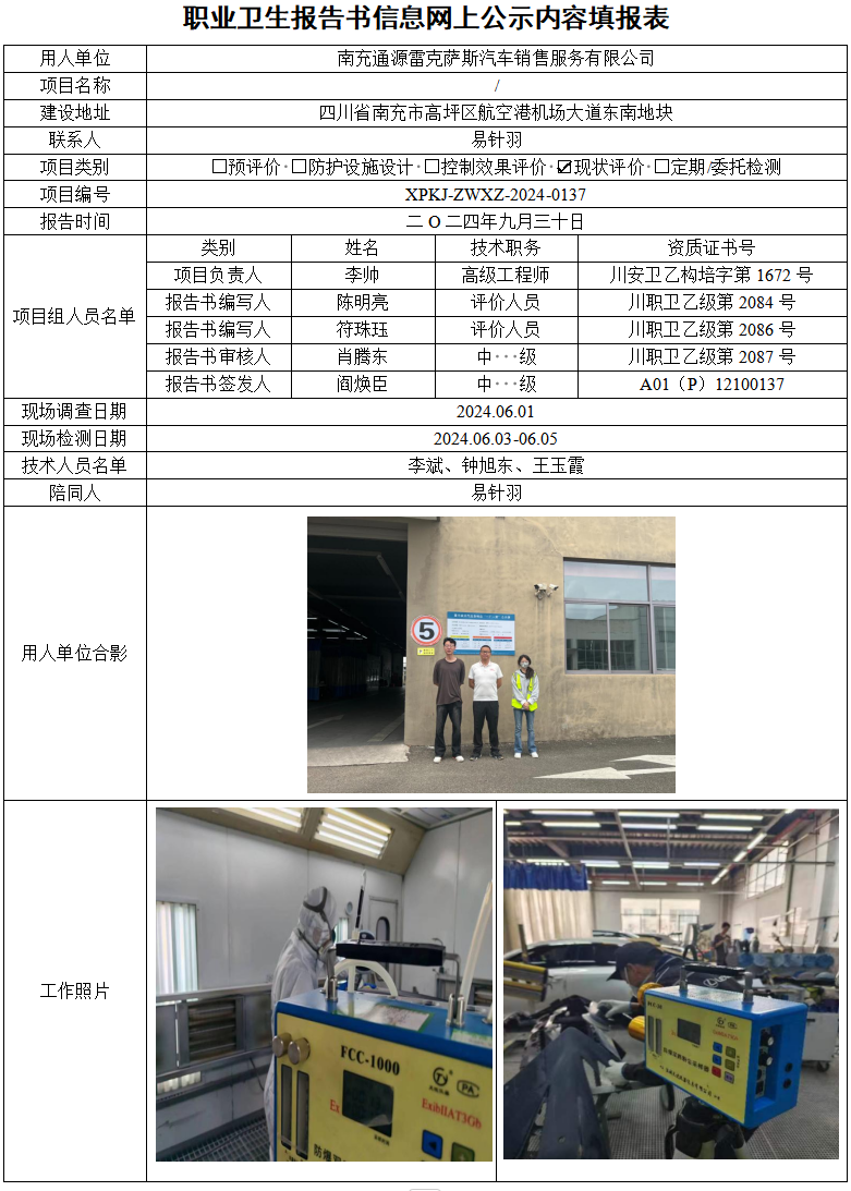南充通源雷克萨撒汽车销售服务有限公司职业病危害因素现状评价