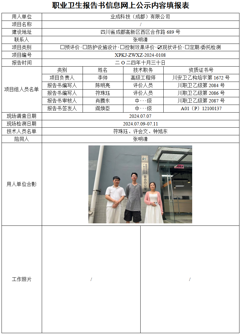 业成科技(成都)有限公司(N1栋1\2\3F、N3栋-2\4F)职业病危害因素现状评价