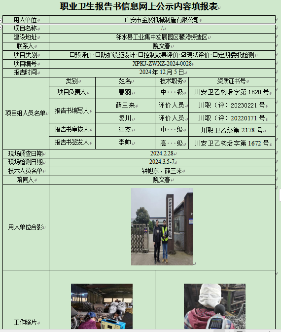 广安市金展机械制造有限公司职业病危害因素现状评价