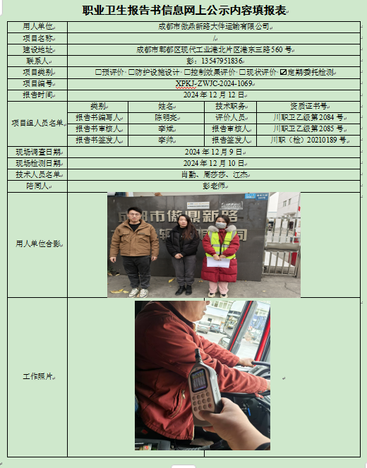 成都市傲鼎新路大件运输有限公司职业病危害因素定期检测