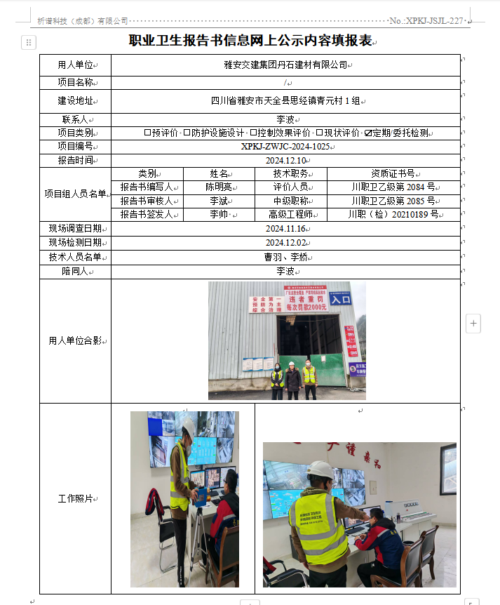 雅安交建集团丹石建材有限公司职业病危害因素定期检测