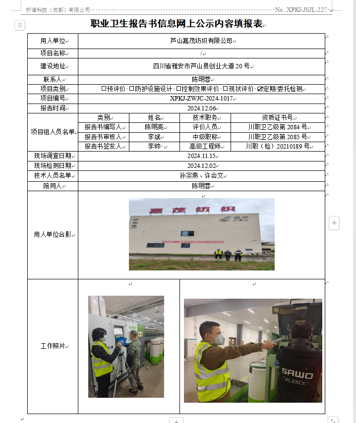 芦山嘉茂纺织有限公司职业病危害因素定期检测